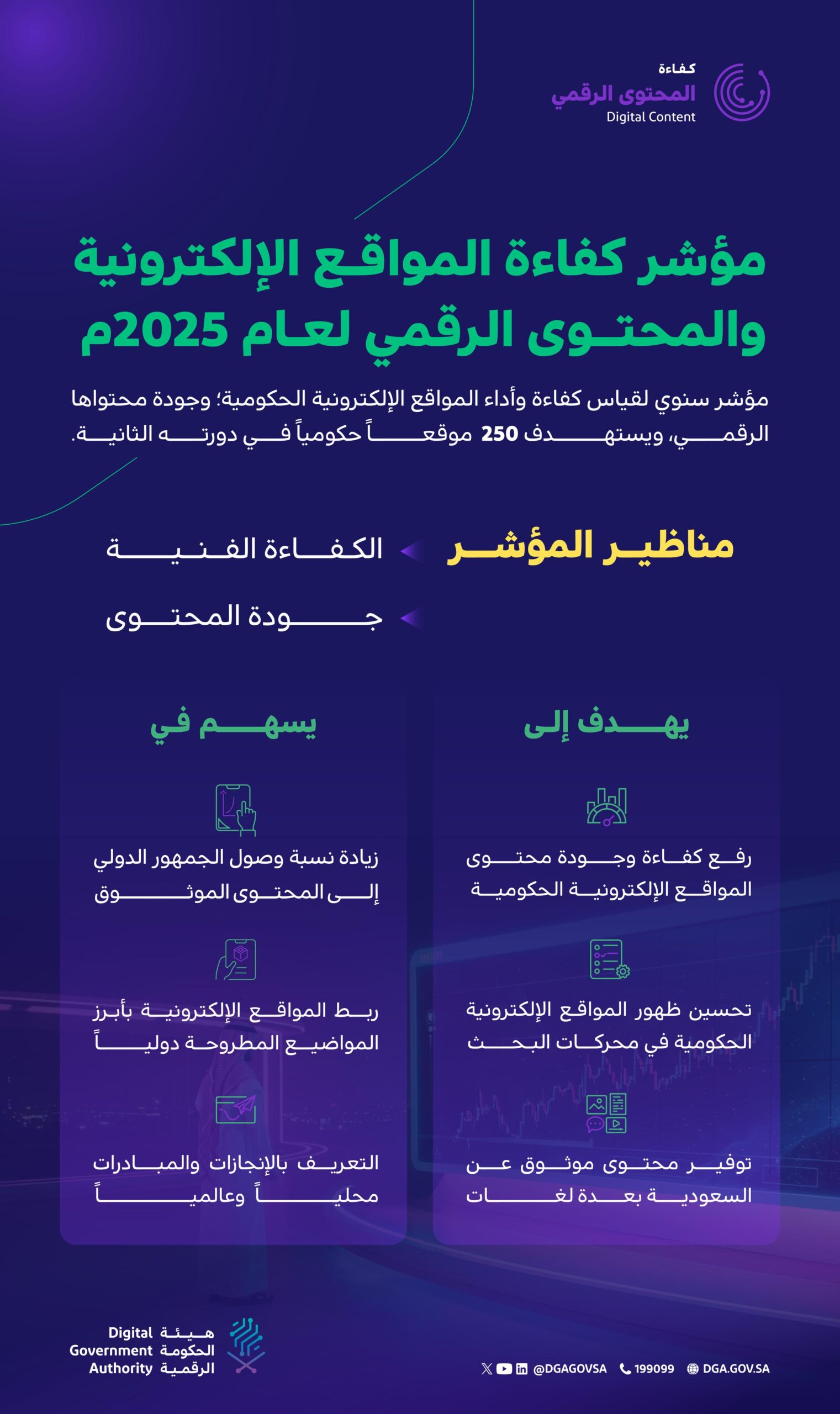 أطلقت هيئة الحكومة الرقمية مؤشر كفاءة المواقع الإلكترونية والمحتوى الرقمي لعام 2025، والذي يهدف إلى تعزيز كفاءة وأداء المواقع الحكومية، والارتقاء بجودة المحتوى الرقمي، ليكون مصدراً موثوقاً يعكس إنجازات ومبادرات المملكة على المستويين المحلي والدولي.