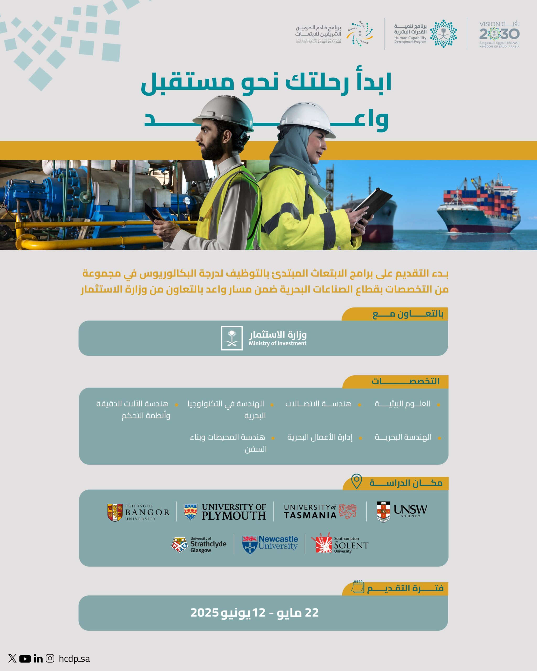 أعلنت وزارة الاستثمار، بالتعاون مع برنامج خادم الحرمين الشريفين للابتعاث، فتح باب التقديم في الدورة الثالثة من برامج الابتعاث المبتدئ بالتوظيف لدراسة البكالوريوس في تخصصات قطاع الصناعات البحرية، ضمن “مسار واعد”، أحد المسارات الإستراتيجية للبرنامج، والمنبثق عن برنامج تنمية القدرات البشرية.