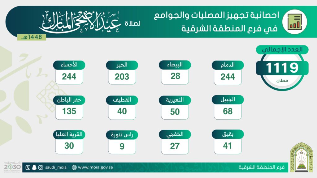 الشؤون الإسلامية بالمنطقة الشرقية تجهز (1119) جامعًا ومصلى لإقامة صلاة عيد الأضحى المبارك