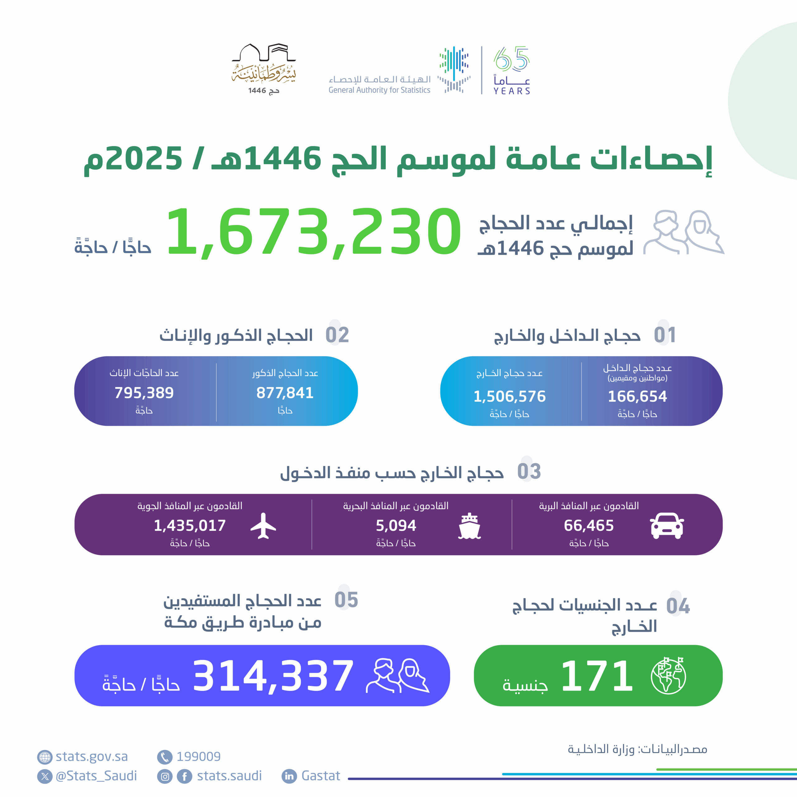 يذكر أن الهيئة العامة للإحصاء اعتمدت في إصدار البيانات والمؤشرات الإحصائية لموسم حج عام 1446ه / 2025م على بيانات السجلات الإدارية من وزارة الداخلية بوصفها المصدر الرئيس للبيانات، لتوفير بيانات سجلية عالية الدقة والموثوقية لإحصاءات الحج وفق نموذج موحَّد يشمل عددًا من العناصر، وذلك امتدادًا للنهج الإحصائي الذي تم اتباعه خلال الأعوام الخمسة الماضية.