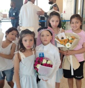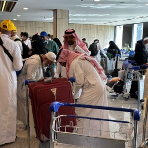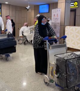 بالورود والحلويات.. جمعية “سند” تحتفي بالحجاج العائدين في مطار الأحساء