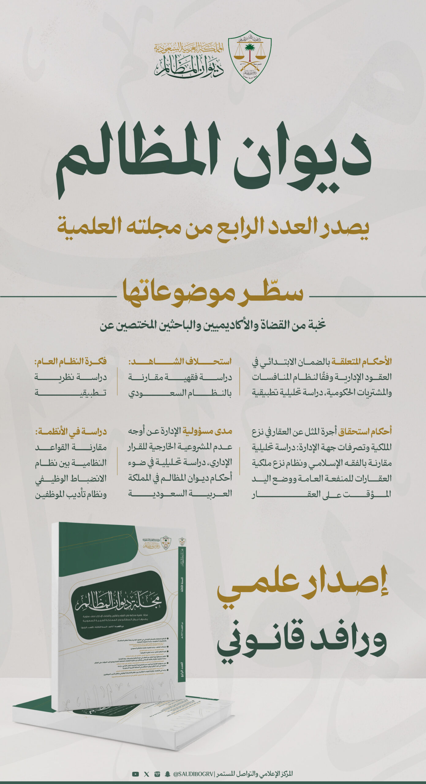 ديوان المظالم يصدر العدد الرابع من مجلته العلمية بمجموعةٍ من المواضيع والدراسات القانونية