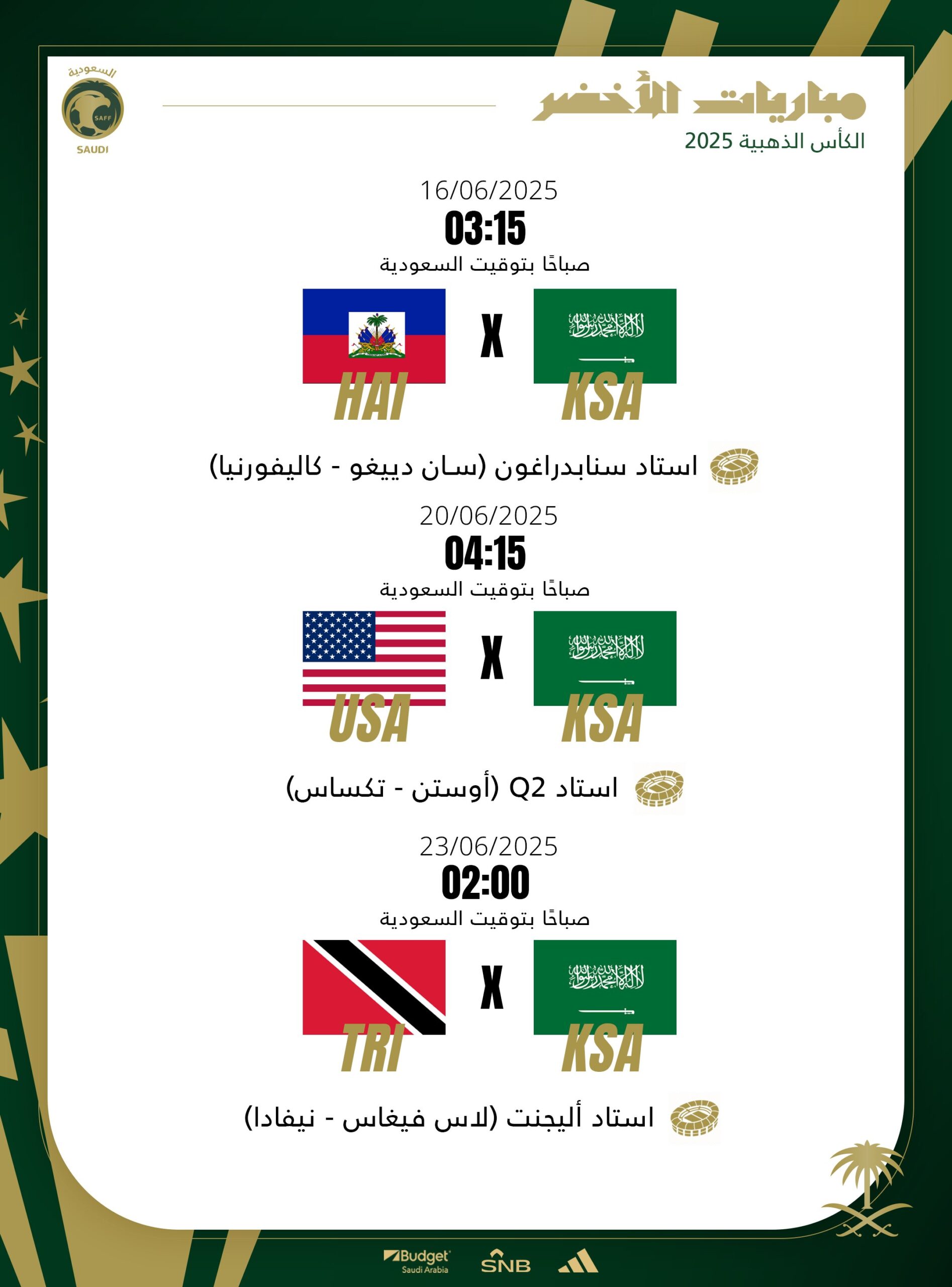 يفتتح المنتخب السعودي الأول لكرة القدم مشواره في بطولة الكأس الذهبية لاتحاد الكونكاكاف 2025، بمواجهة منتخب هايتي، ضمن منافسات الجولة الأولى من دور المجموعات، في البطولة التي تستضيفها الولايات المتحدة الأمريكية وكندا خلال الفترة من 14 يونيو حتى 6 يوليو المقبل.