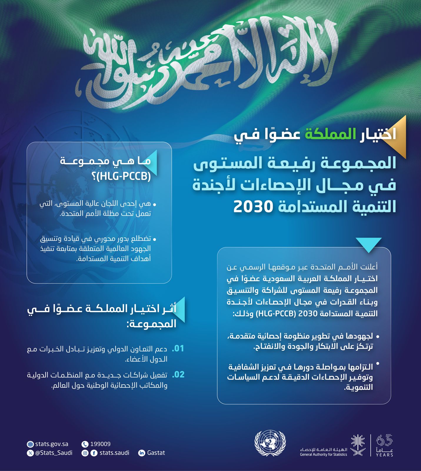 أعلنت الأمم المتحدة عن اختيار المملكة العربية السعودية ممثلةً بالهيئة العامة للإحصاء عضوًا في المجموعة رفيعة المستوى للشراكة والتنسيق وبناء القدرات في مجال الإحصاءات لأجندة التنمية المستدامة 2030 (HLG-PCCB)، ويأتي هذا الإعلان تأكيدًا على جهود المملكة في تطوير منظومة إحصائية متقدمة، ترتكز على الابتكار والجودة والانفتاح، وانعكاساً لالتزام المملكة بمواصلة دورها في تعزيز الشفافية وتوفير الإحصاءات الدقيقة لدعم السياسات التنموية وفق مستهدفات رؤية السعودية 2030.