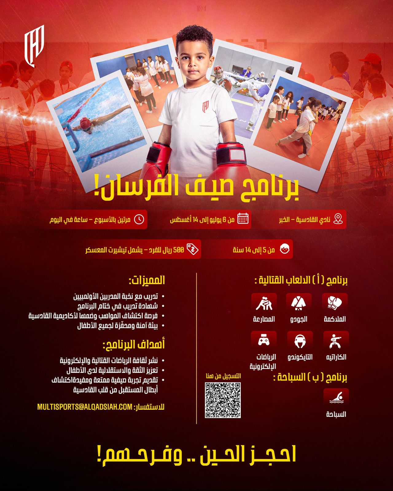 في خطوة نوعية تهدف إلى تعزيز مهارات النشء خلال الإجازة الصيفية، أعلنت إدارة شركة نادي القادسية عن انطلاق البرنامج الصيفي تحت شعار “صيف الفرسان”، والتي تجمع بين دورات تعليم السباحة ورياضات الفنون القتالية، في تجربة رياضية متكاملة تمتد على مدى ثمانية أسابيع، من 6 يوليو حتى 28 أغسطس 2025، وتستهدف الفئة العمرية من 5 إلى 14 عامًا.