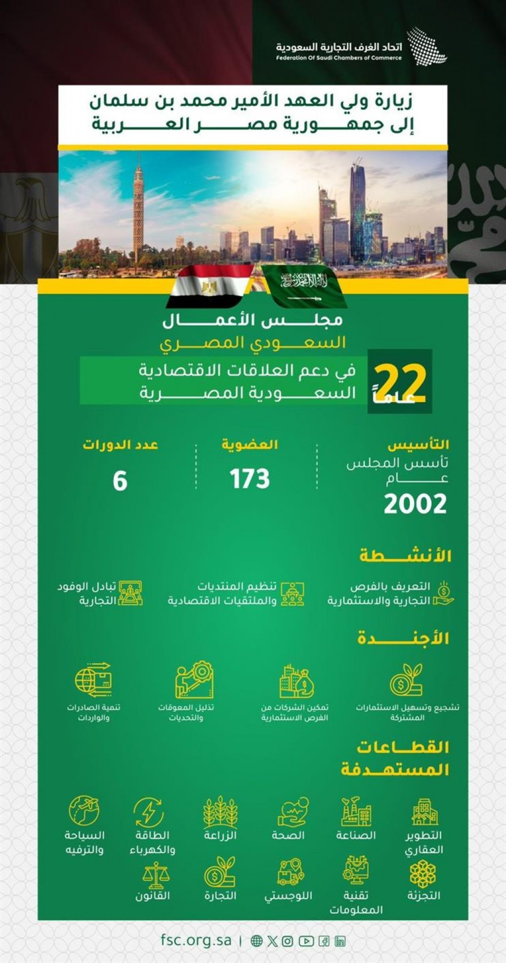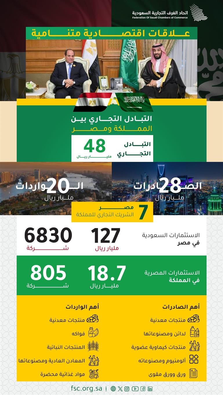 ومن الجهات التي تعمل على تحقيق تلك الأهداف “مجلس الأعمال السعودي المصري”، الذي يؤدي دورًا رئيسيًا في تسهيل التعاون بين الشركات والمستثمرين من الجانبين، وتنظيم اللقاءات التجارية؛ بهدف تعزيز فرص التعاون واستكشاف مجالات جديدة للاستثمار، إضافة إلى عددٍ من اللجان المشتركة التي تُنمّي العلاقات في مختلف المجالات من خلال العمل على تذليل العقبات التي قد تواجه المستثمرين وتعزيز البيئة الاقتصادية في كلا البلدين.