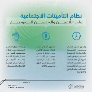 أعلنت وزارة الرياضة والمؤسسة العامة للتأمينات الاجتماعية عن البدء بتطبيق نظام التأمينات الاجتماعية على اللاعبين والمدربين السعوديين اعتبارًا من يوم الثلاثاء المقبل الموافق 1 يوليو 2025م.