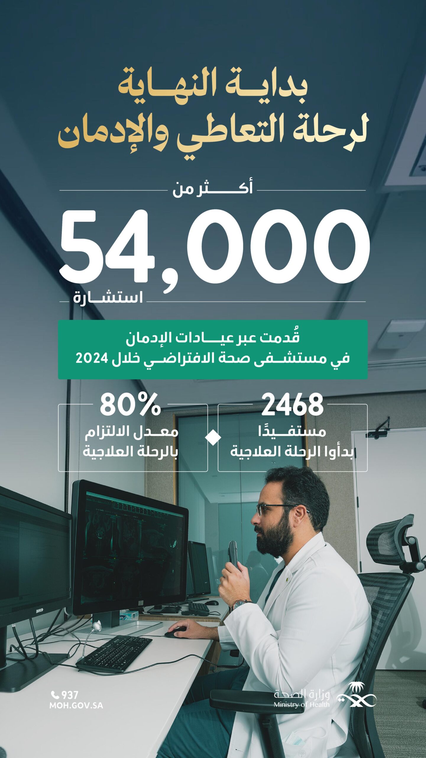 بالتزامن مع اليوم العالمي لمكافحة المخدرات، كشفت وزارة الصحة عن تقديم مستشفى “صحة” الافتراضي، أكبر مستشفى افتراضي في العالم، أكثر من 54 ألف استشارة علاجية في الإدمان خلال عام 2024، وذلك ضمن جهود متكاملة لتسهيل الوصول للخدمات الصحية وتلقّيها بأحدث التقنيات، وبأعلى درجات الخصوصية والجودة الصحية، انسجامًا مع مستهدفات برنامج “تحوّل القطاع الصحي” ضمن رؤية المملكة 2030، التي تسعى إلى بناء “مجتمع حيوي” ينعم بصحة مستدامة.