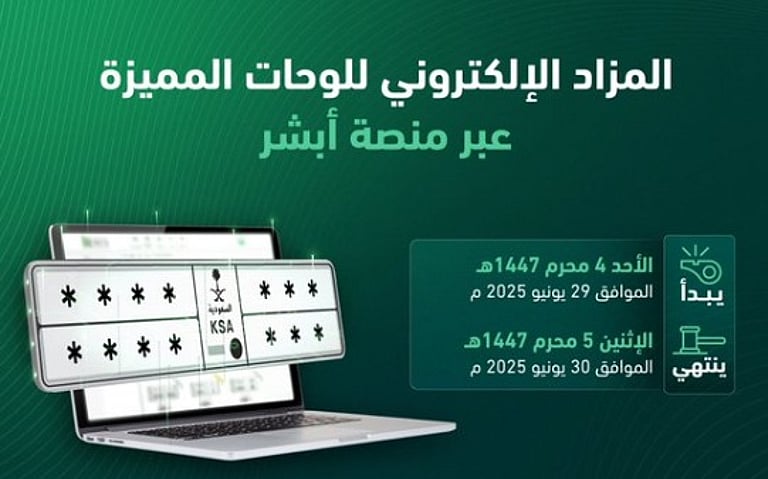 ولفت “المرور” عبر حسابه بمنصة “إكس”، إلى أن طرح المزاد يكون عبر منصة “أبشر”، التي تمكّن الراغبين في شراء اللوحات المميزة من المشاركة في المزاد إلكترونياً.