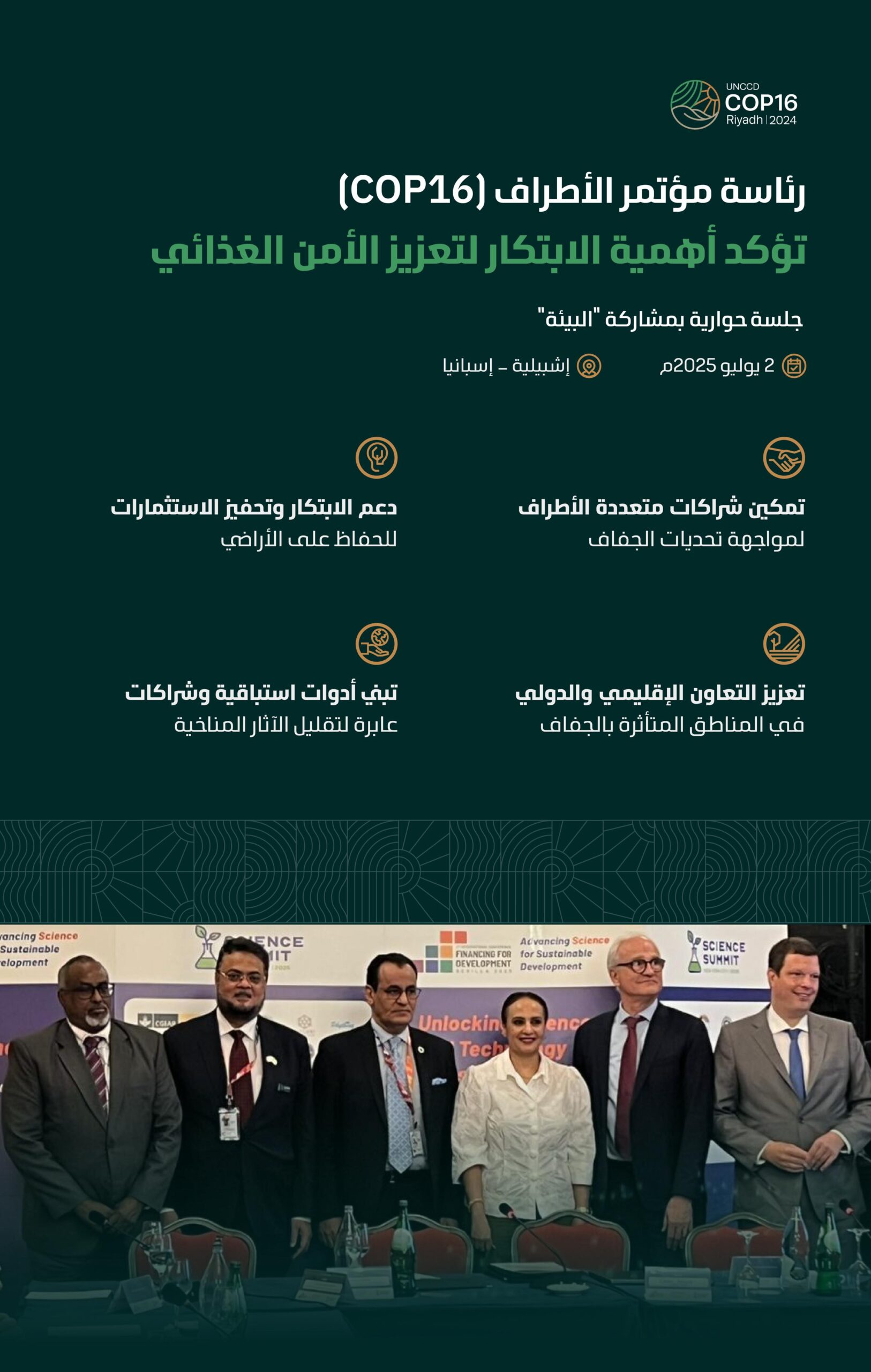 رئاسة (COP16) تؤكد على أهمية الابتكار وتمكين الشراكات الدولية لمواجهة الجفاف وتعزيز الأمن الغذائي