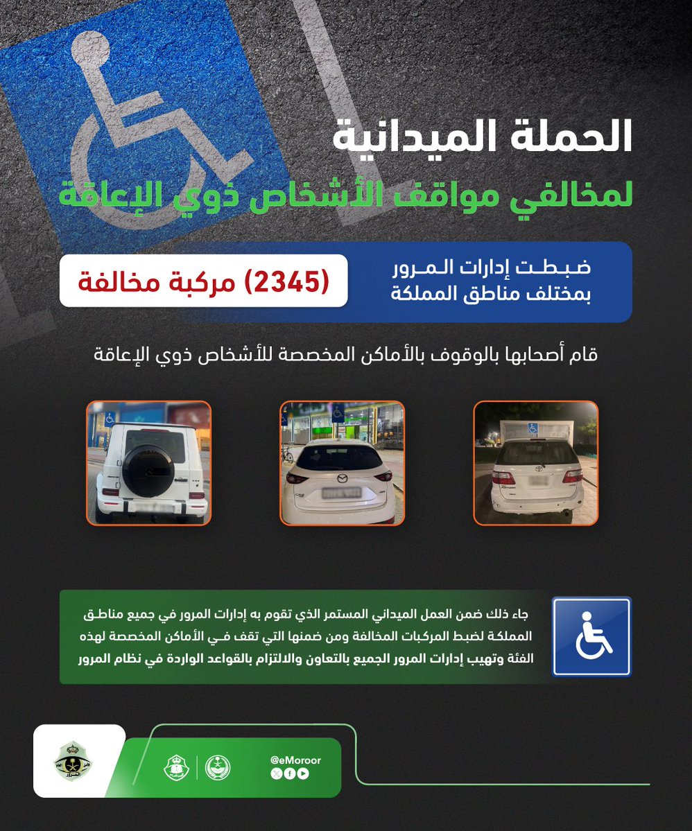 أعلنت الإدارة العامة للمرور عن ضبط 2345، مركبة مخالفة متوقفة في الأماكن المخصصة للأشخاص ذوي الإعاقة، وذلك في جميع مناطق المملكة.