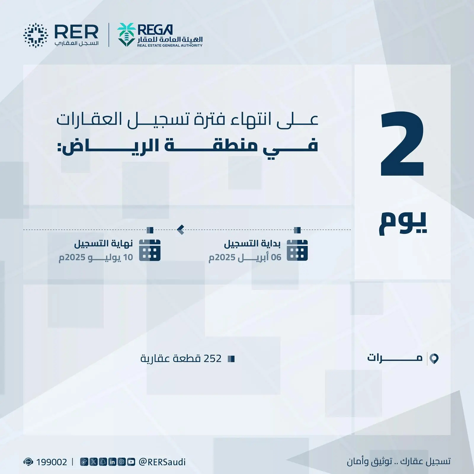 أعلنت الهيئة العامة للعقار عن قرب انتهاء المهلة المحددة للتسجيل العيني الأول لـ(207.885) قطعة عقارية في (230) حيًا بالمنطقة الشرقية، و(252) قطعة عقارية في محافظة مِرات بمنطقة الرياض، وذلك بنهاية يوم الخميس 15 محرم 1447هـ، الموافق 10 يوليو 2025م.