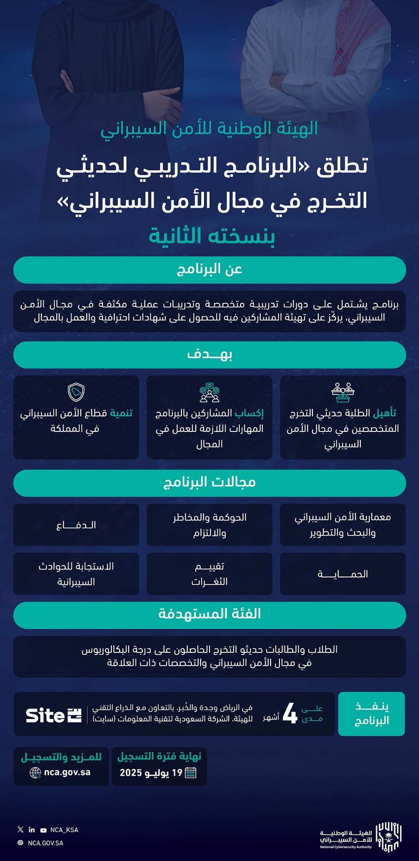 ويستهدف البرنامج تدريب الطلاب والطالبات حديثي التخرج الحاصلين على درجة البكالوريوس في كافة تخصصات الأمن السيبراني والتخصصات ذات العلاقة، وإكسابهم المهارات الأساسية اللازمة وفق الاحتياجات الحالية والمستقبلية في مجال الأمن السيبراني، وذلك على مدى أربعة أشهر في الرياض وجدة والخُبر، بالتعاون مع الذراع التقني للهيئة، الشركة السعودية لتقنية المعلومات “سايت”.