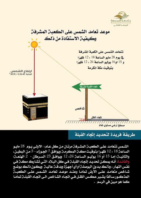 وأوضح المرصد أن هذه الظاهرة الفلكية تُمكِّن سكان المناطق التي تشترك مع مكة المكرمة في جزء من النهار من تحديد اتجاه القبلة بدقة، وذلك من خلال وضع شاخص متعامد على سطح الأرض، حيث يكون اتجاه القبلة معاكسًا لاتجاه الظل في لحظة التعامد.