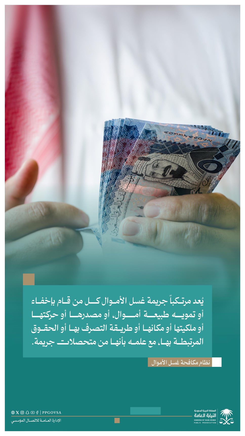 أكدت النيابة العامة، أنَّ أحكام نظام مكافحة غسل الأموال بيّنت صور الجريمة؛ صوناً للأموال، وردعاً للممارسات غير المشروعة.