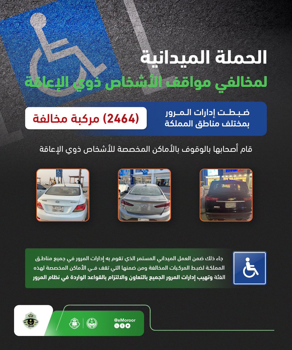 أعلنت الإدارة العامة للمرور عن ضبط 2464 مركبة مخالفة متوقفة في الأماكن المخصصة للأشخاص ذوي الإعاقة، وذلك في جميع مناطق المملكة.