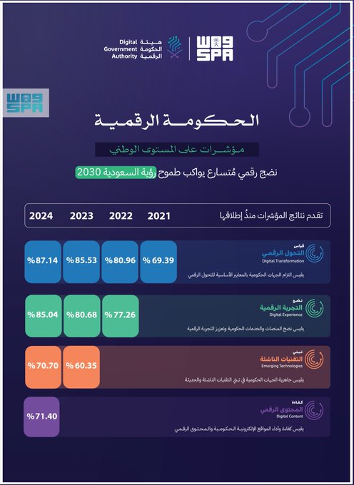 أظهرت أربعة مؤشرات وطنية أطلقتها هيئة الحكومة الرقمية في المملكة العربية السعودية تقدّمًا نوعيًا في مسيرة التحول الرقمي الحكومي، مما يُعزز مكانة المملكة في قائمة الدول الرائدة رقميًا على مستوى العالم، ويؤكد التزام الجهات الحكومية برؤية المملكة 2030 نحو حكومة رقمية فعالة تضع المستفيد في قلب الخدمة.