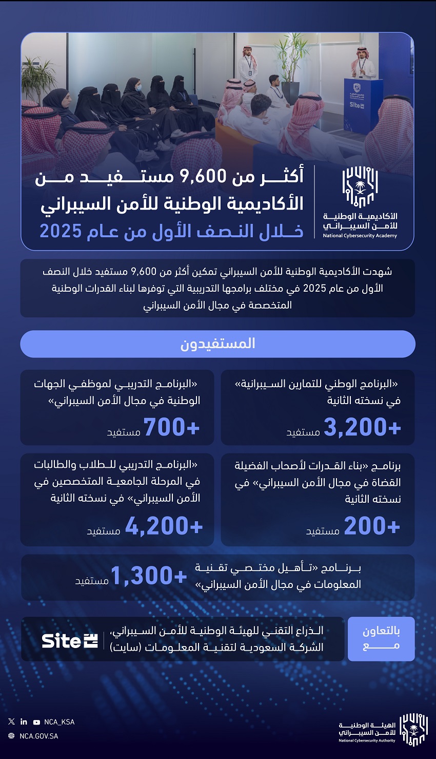كشفت الأكاديمية الوطنية للأمن السيبراني عن تمكين أكثر من 9,600 مستفيد خلال النصف الأول من عام 2025 في مختلف برامجها التدريبية التي توفرها ضمن المرحلة الثانية من برنامج «سايبرك» لتنمية قطاع الأمن السيبراني الهادف إلى بناء القدرات الوطنية المتخصصة في مجال الأمن السيبراني، ورفع الجاهزية السيبرانية لدى الجهات الوطنية، بما يسهم في تعزيز الأمن السيبراني في المملكة.