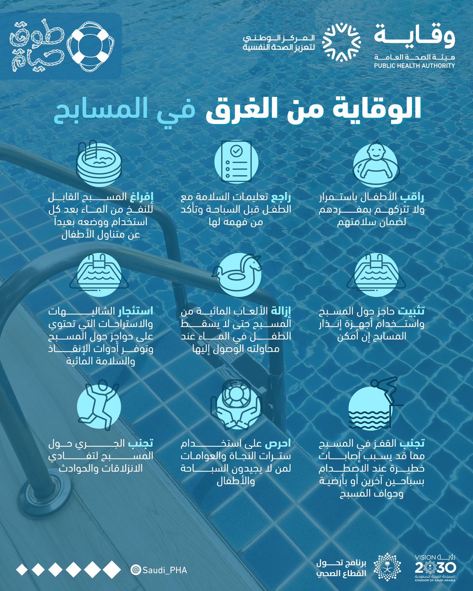 كشف المركز الوطني لتعزيز الصحة النفسية عن بعض الوقاية من الغرق في المسابح.