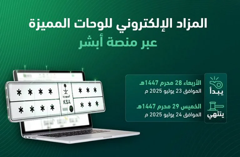 وأشارت الإدارة، عبر منصة «إكس»، إلى أنَّ المزاد يتم طرحه عبر منصة أبشر، التي تمكّن الراغبين في شراء اللوحات المميزة من المشاركة في المزاد إلكترونيًا.