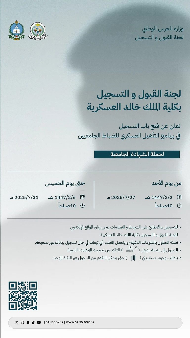 أعلنت لجنة القبول والتسجيل بكلية الملك خالد العسكرية، التابعة لوزارة الحرس الوطني، عن فتح باب التسجيل في برنامج التأهيل العسكري للضباط الجامعيين، لحملة الشهادات الجامعية، وذلك اعتبارًا من يوم الأحد 2/2/1447هـ الموافق 27 يوليو 2025م، وحتى يوم الخميس 6/2/1447هـ الموافق 31 يوليو 2025م، عند الساعة العاشرة صباحًا.