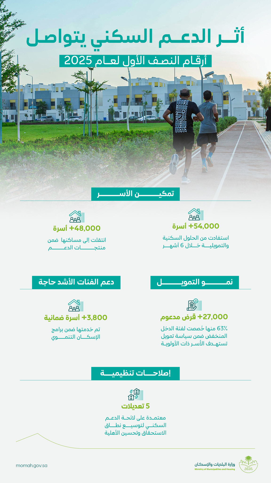 كشفت وزارة البلديات والإسكان عن استفادة أكثر من54,000 أسرة سعودية من برامج الدعم السكني خلال النصف الأول من عام 2025، وذلك استمرارًا للجهود المبذولة لتحقيق مستهدفات برنامج الإسكان – أحد برامج رؤية السعودية 2030 – برفع نسبة التملك السكني إلى 70% بحلول عام 2030.