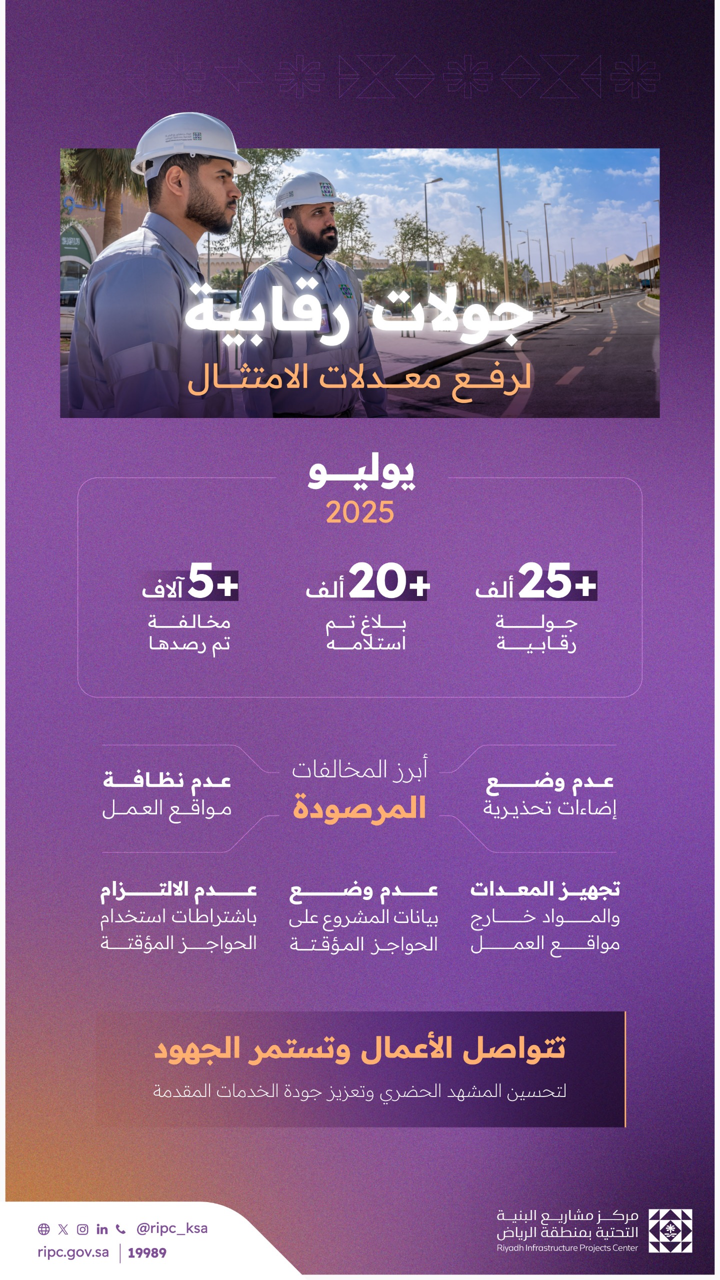 مركز مشاريع البنية التحتية بمنطقة الرياض ينفذ أكثر من 25 ألف جولة رقابية خلال شهر يوليو 2025م