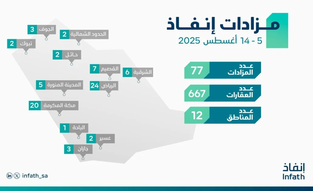 “إنفاذ” ينظم 77 مزادًا لبيع 667 أصلًا بمناطق المملكة