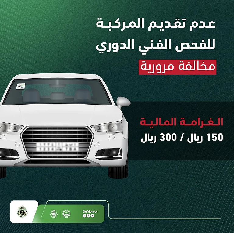 وأكملت الإدارة العامة للمرور، أن «عدم تقديم المركبة للفحص الفني الدوري مخالفة مرورية تصل غرامتها المالية من 150 ريال إلى 300 ريال».