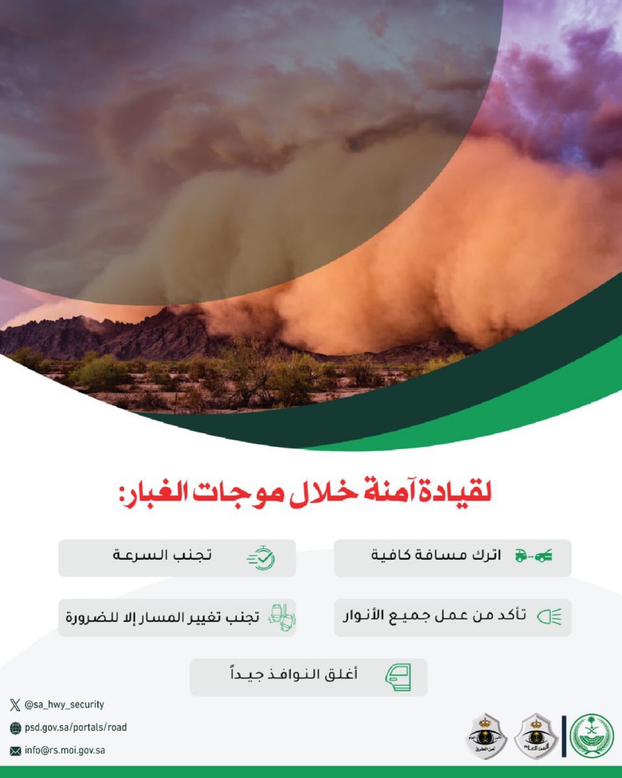 أمن الطرق يحذر من القيادة في أجواء الغبار ويدعو للالتزام بإرشادات السلامة