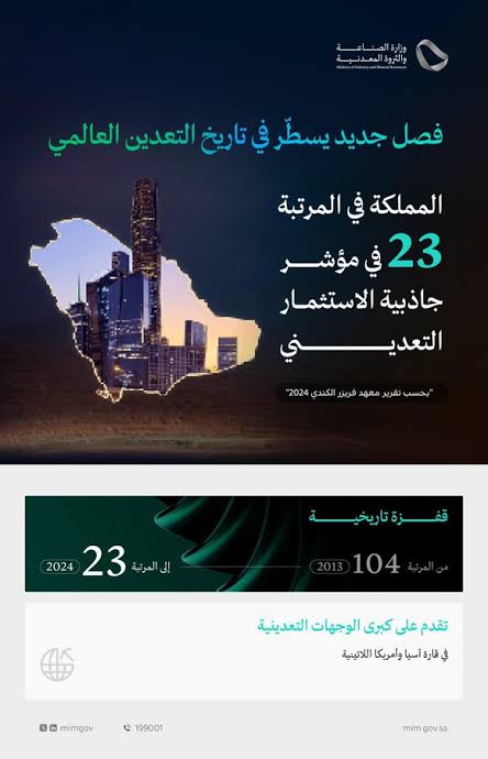 قفز قطاع التعدين السعودي من المركز (104) إلى (23) عالميًّا في مؤشر جاذبية الاستثمار التعديني، وفقًا لتقرير المسح السنوي لشركات التعدين الصادر عن معهد فريزر الكندي لعام 2024، حيث حقق إنجازًا عالميًّا غير مسبوق خلال العقد الأخير، متقدّمًا على قطاعات التعدين في وجهات بارزة في آسيا وأمريكا اللاتينية، لترسخ المملكة مكانتها واحدةً من أبرز القوى الصاعدة عالميًّا في قطاع التعدين.
