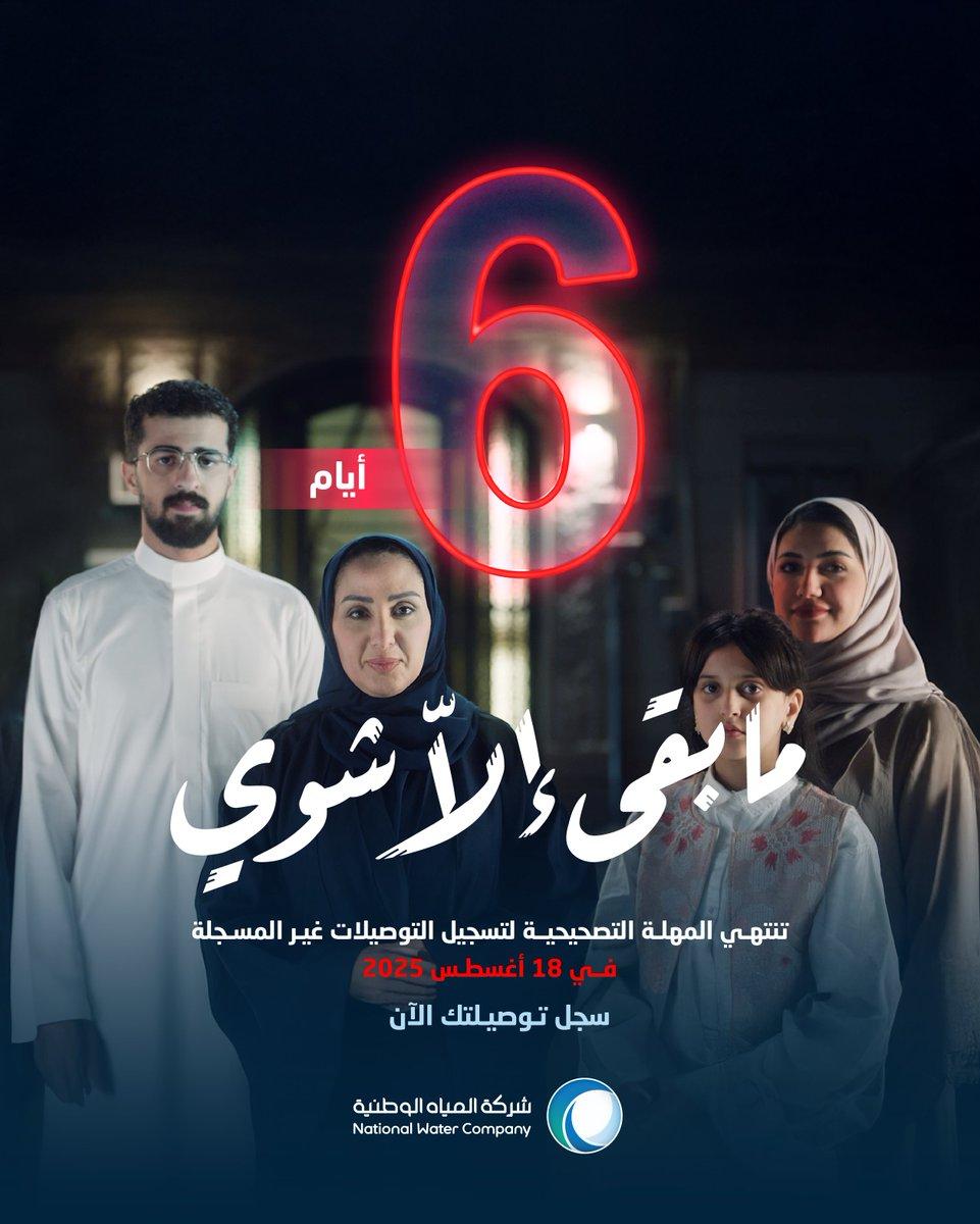 وأوضحت الشركة أن المهلة المتبقية لا تتجاوز 6 أيام، وبعدها ستنتهي فترة الإعفاء الممنوحة للمرتفقين بالخدمة بطريقة غير نظامية، أو الذين لم يقوموا بتسجيل توصيلاتهم، مشيرة إلى أن إجراءات التصحيح والتسجيل متاحة عبر قنواتها الرسمية، سواء من خلال تطبيق المياه الوطنية على الهواتف الذكية أو عبر الفرع الإلكتروني (www.nwc.com.sa).