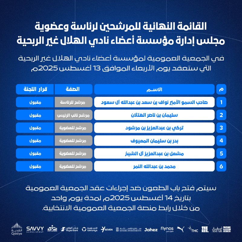 وضمّت القائمة النهائية للمرشحين لرئاسة وعضوية مجلس إدارة مؤسسة أعضاء نادي الهلال غير الربحية كلًّا من: