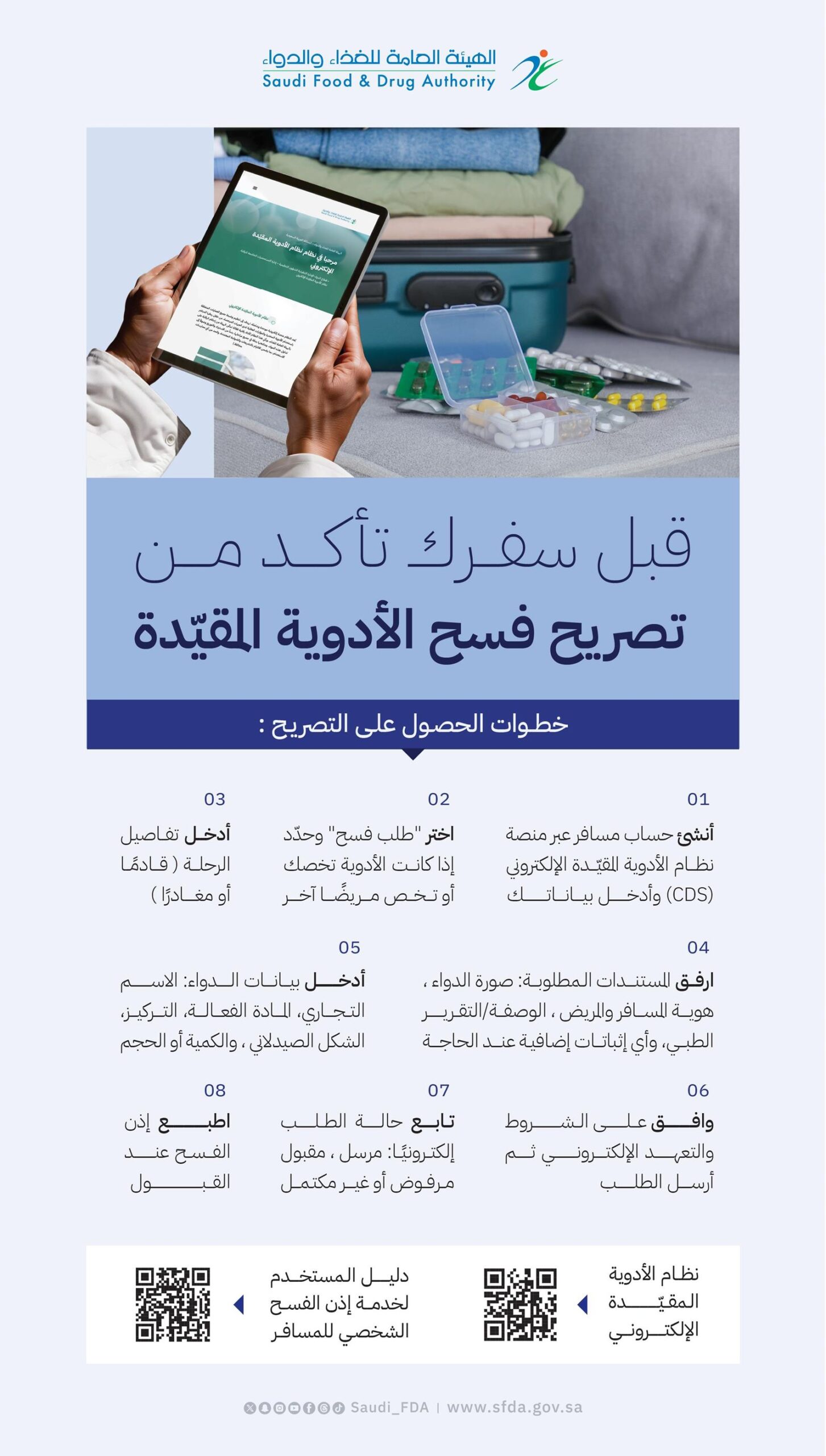 وأكّدت إتاحة جميع المعلومات المتعلقة بالخدمة عبر منصتها الإلكترونية “نظام الأدوية المقيّدة”: https://cds.sfda.gov.sa، ويمكن للمسافر إنشاء حساب شخصي وتعبئة البيانات اللازمة، وتقديم طلب فسح إلكتروني يتضمن بيانات المريض وتفاصيل الرحلة والمرفقات المطلوبة مثل الوصفة أو التقرير الطبي وصورة الدواء وإثبات الهوية.