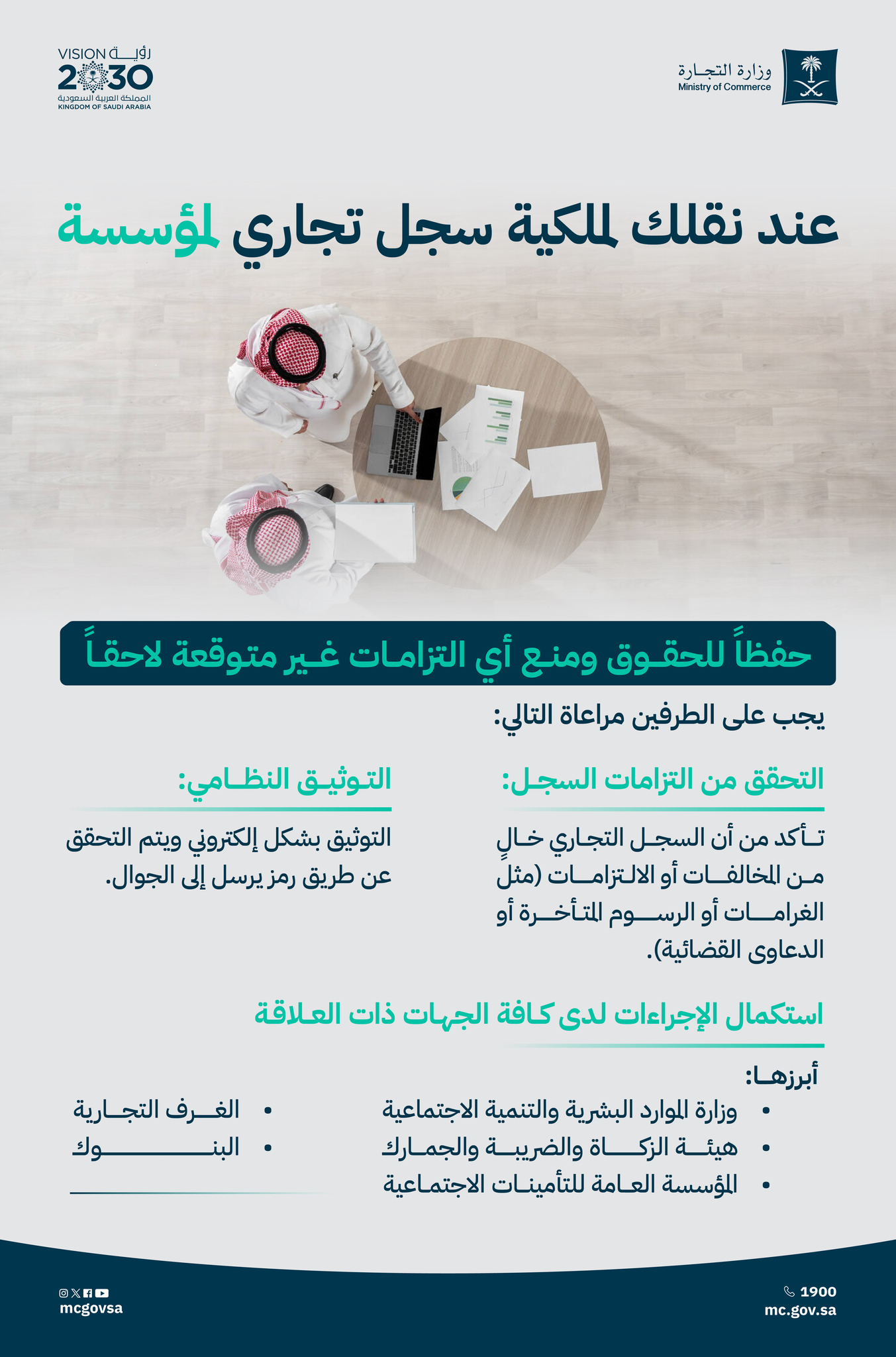 “التجارة” توضح إجراءات نقل ملكية السجل التجاري لمؤسسة لحفظ الحقوق وتجنب أي التزامات