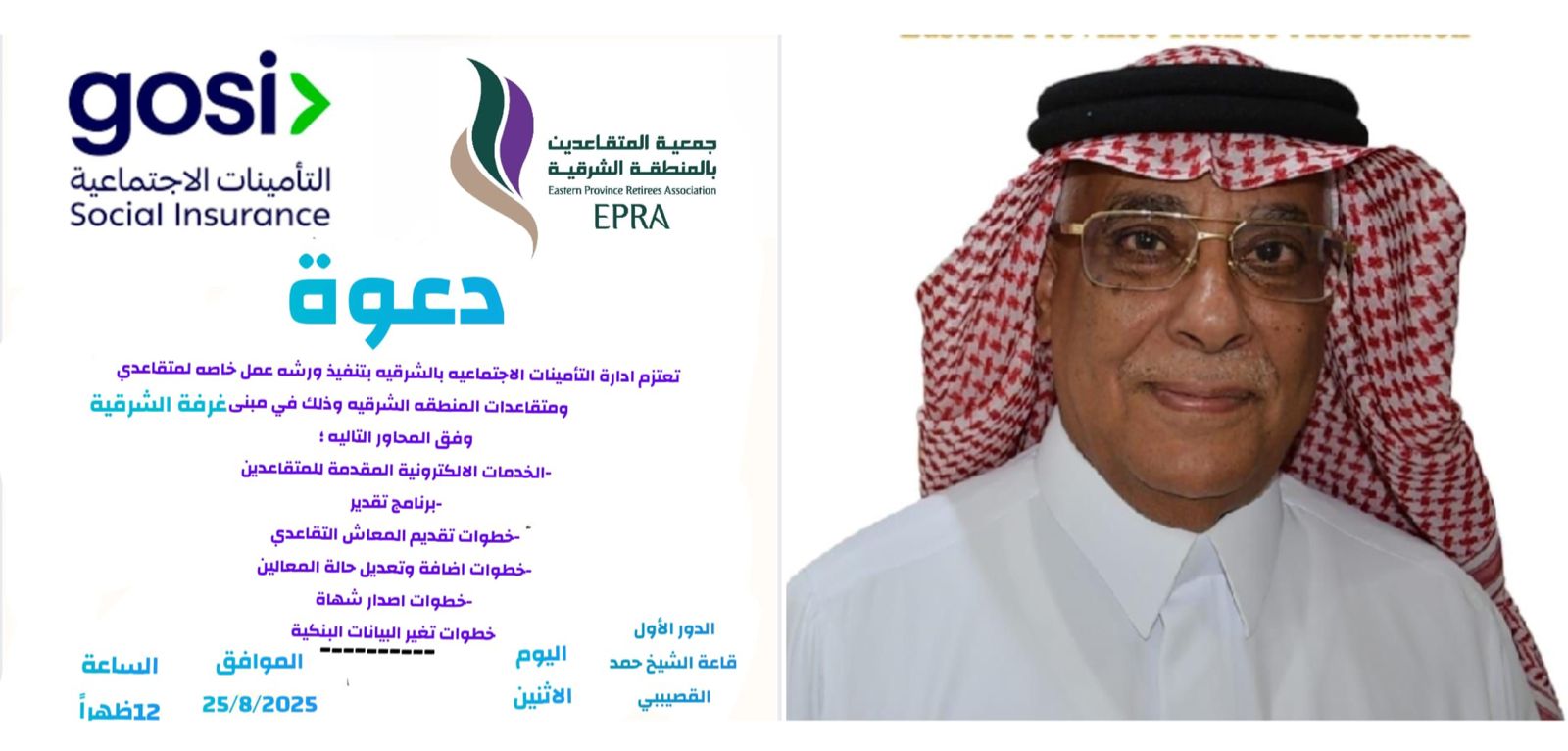 تلقت جمعية المتقاعدين بالمنطقة الشرقية دعوة من المؤسسة العامة للتأمينات الاجتماعية بالتعاون مع غرفة الشرقية لحضور ورشة عمل تعريفية بالخدمات المقدمة للمستفيدين والمتقاعدين يوم الاثنين 25 أغسطس 2025م الساعة 12:00 ظهرًا في مقر غرفة الشرقية قاعة الشيخ حمد القصيبي .