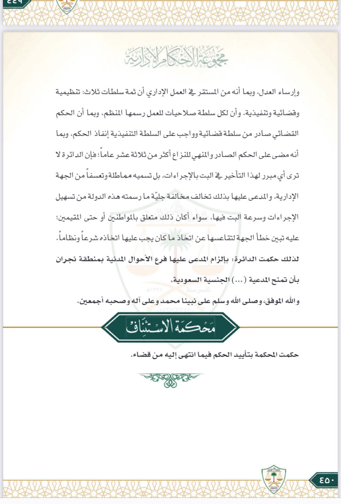 وقد قبلت المحكمة الإدارية بنجران الدعوى ولائيًا ومكانيًا، واستنادًا على المادة السابعة من نظام الجنسية السعودية، التي تنص على أن يكون سعوديًا من ولد داخل المملكة العربية السعودية أو خارجها لأب سعودي أو لأم سعودية وأب مجهول الهوية أو لا جنسية له، عليه حكمت الدائرة ناظرة الدعوى بإلزام المدعى عليها فرع الأحوال المدنية بمنطقة نجران بمنح الجنسية السعودية للفتاة مقدمة الدعوى، وأيدت محكمة الاستئناف الإدارية حكم الدائرة، الأمر الذي أصبح به الحكم واجب التنفيذ.