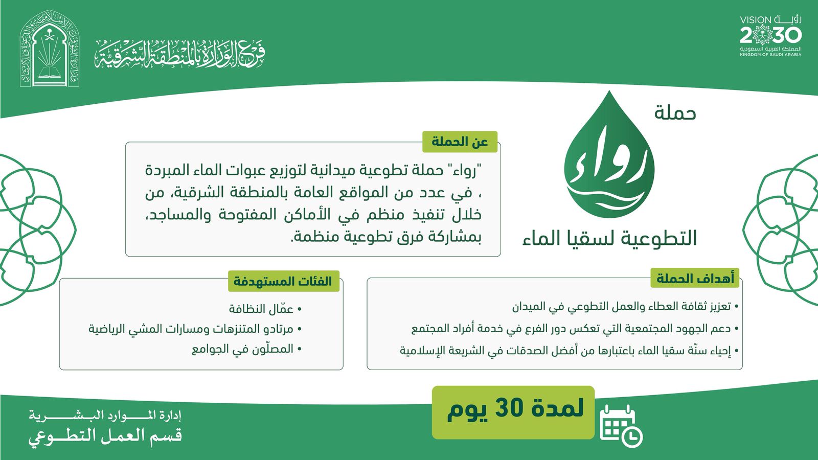 يطلق فرع وزارة الشؤون الإسلامية والدعوة والإرشاد بالمنطقة الشرقية مساء اليوم الأحد، الأول من شهر ربيع الأول 1447هـ، حملة “رواء”، التطوعية تستمر لمدة شهر كامل، وتشمل توزيع أكثر من (24,000) عبوة ماء مبردة في عددٍ من المواقع العامة المفتوحة، بمشاركة فرق تطوعية من مختلف فئات المجتمع. وتهدف الحملة إلى تطبيق الهدي النبوي الشريف في قوله صلى الله عليه وسلم: “أفضل الصدقة سقي الماء”، حيث تستهدف المصلين في الجوامع، ومرتادي المتنزهات، ومسارات المشي الرياضية، إضافةً إلى عمال النظافة، عبر نقاط توزيع ميدانية منظمة. وتأتي هذه المبادرة ضمن جهود فرع الوزارة بالمنطقة الشرقية في تعزيز القيم الإنسانية والمجتمعية النبيلة، ودعم العمل التطوعي، من خلال إتاحة الفرص لمشاركة مختلف شرائح المجتمع في أعمال الخير.