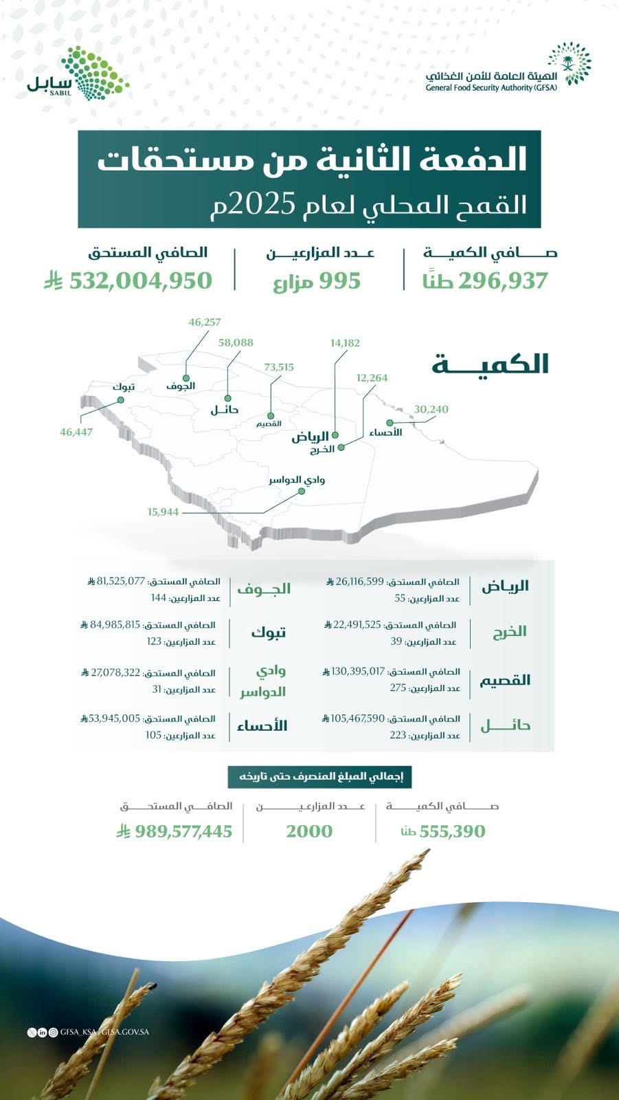 أعلنت الهيئة العامة للأمن الغذائي عن صرف مستحقات الدفعة الثانية لمزارعي القمح المحلي، اللذين قاموا بتوريد الكميات المخصصة لهم لهذا الموسم 1446/1447هـ(2025م)، بفروع الشركة الوطنية لإمدادات الحبوب “سابل”، وأغلاق حساباتهم عبر المنصة الالكترونية “محصولي”، وذلك حتى تاريخ 10/2/1447هـ الموافق 4/8/2025م.