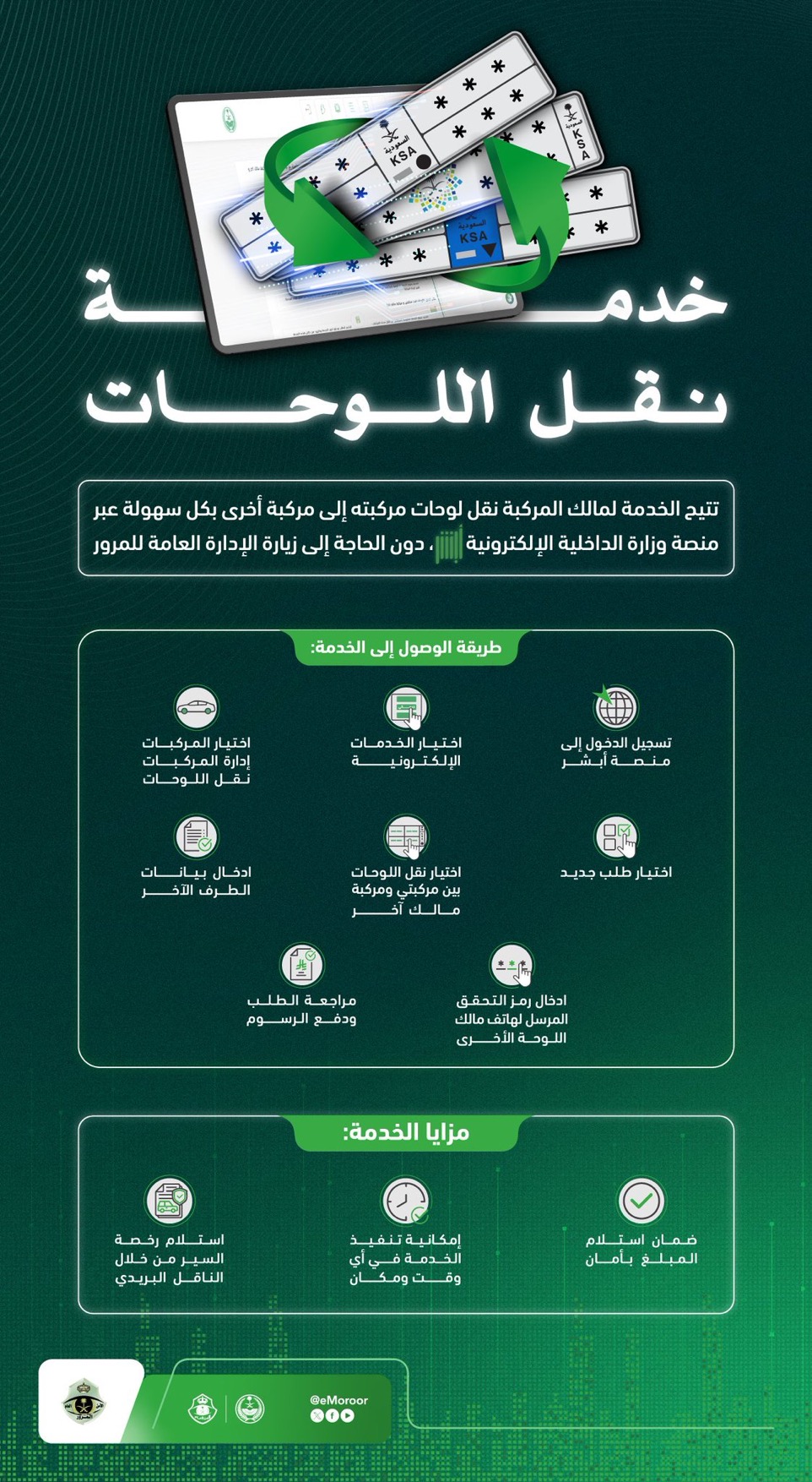 أطلقت الإدارة العامة للمرور خدمة إلكترونية جديدة عبر منصة وزارة الداخلية الإلكترونية “أبشر”، تتيح لمالكي المركبات إمكانية نقل لوحات مركباتهم من مركبة إلى أخرى بكل سهولة ويسر، دون الحاجة إلى زيارة إدارات المرور.