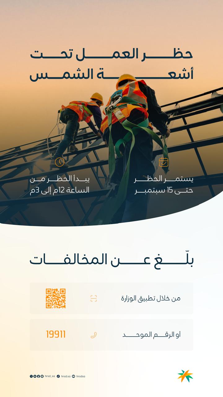 تواصل وزارة الموارد البشرية والتنمية الاجتماعية جهودها في متابعة تطبيق قرار حظر العمل تحت أشعة الشمس، حفاظًا على سلامة وصحة العاملين، وضمان توفير بيئة عمل آمنة وصحية وفق اشتراطات السلامة والصحة المهنية، ويأتي القرار المطبق سنويًا خلال الفترة من 15 يونيو وحتى 15 سبتمبر، تأكيدًا على أهمية الإجراءات الوقائية لحماية العاملين خلال ساعات الذروة الصيفية.