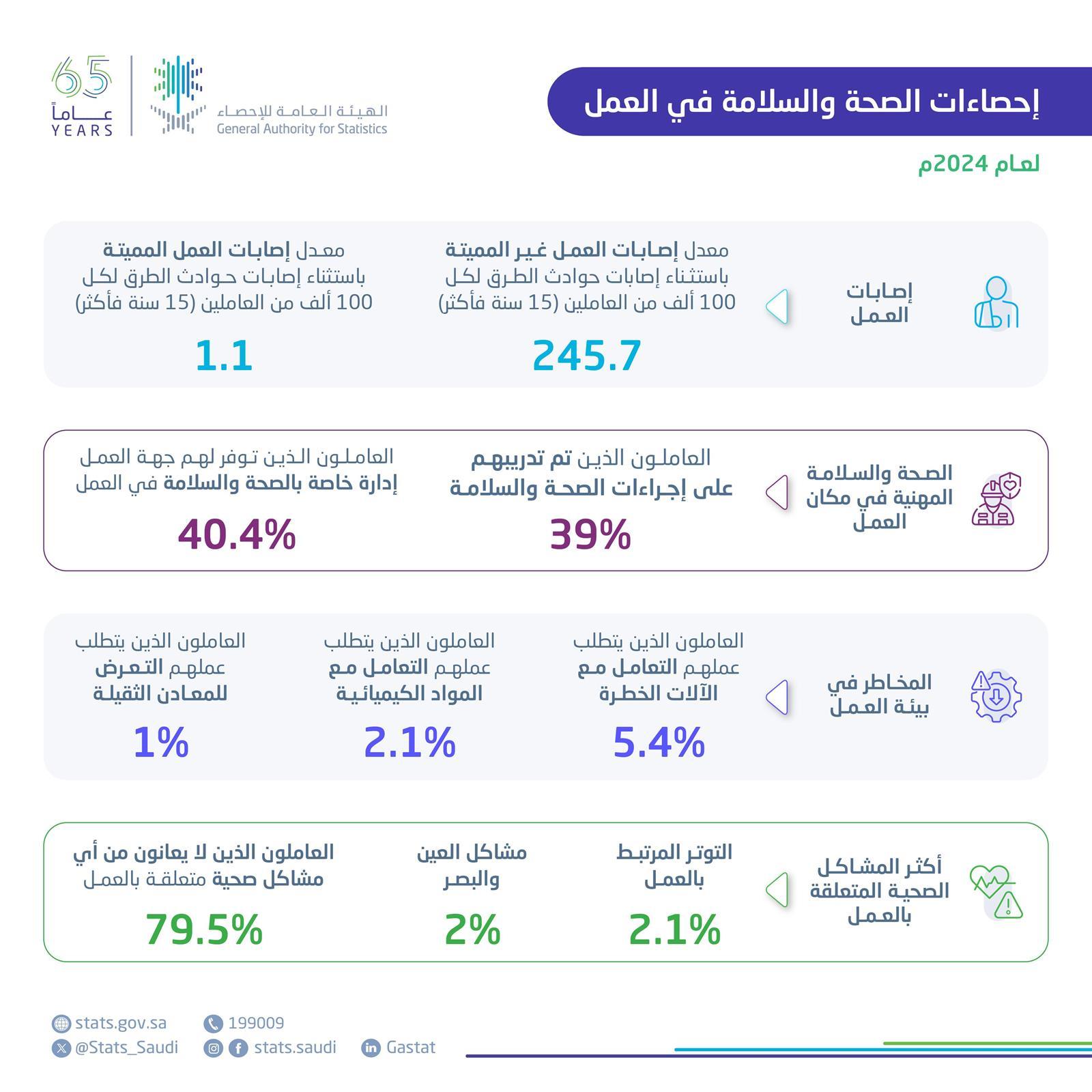 يذكر أن تقديرات إحصاءات الصحة والسلامة في العمل تستند إلى البيانات المُبلّغة ذاتيًا من المشاركين من خلال الزيارات الميدانية “المنزلية” التي تمت في المسح الصحي الوطني 2024م، باستثناء معدل إصابات العمل، حيث تم حسابه من البيانات السجلية من المجلس الوطني للسلامة والصحة المهنية وتقديرات السكان من الهيئة العامة للإحصاء لعام 2024م.