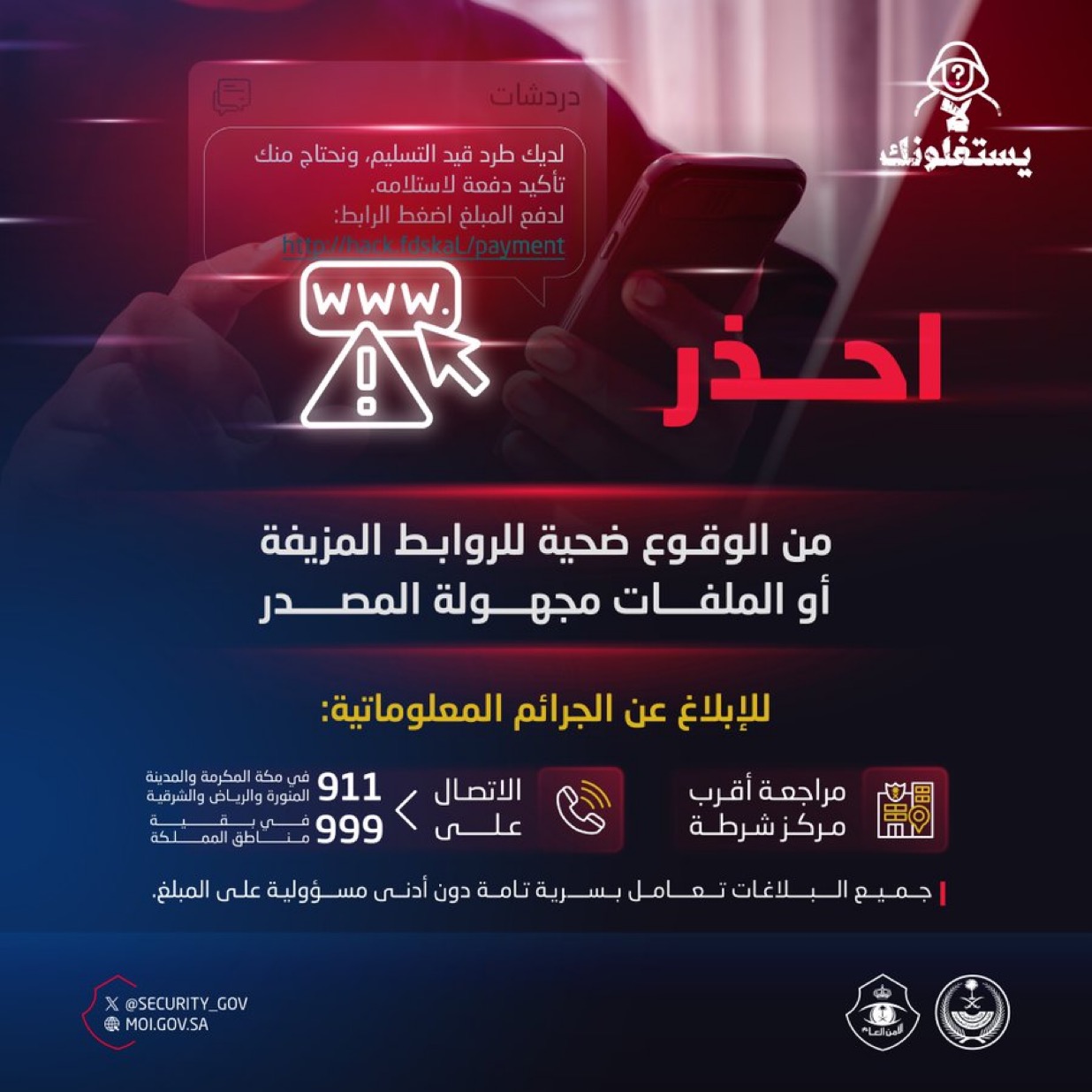 كما دعا الأمن العام جميع أفراد المجتمع إلى سرعة الإبلاغ عن أي محاولات احتيال أو جرائم معلوماتية عبر مراجعة أقرب مركز شرطة، أو الاتصال بالرقم 911 في مناطق مكة المكرمة والرياض والشرقية، أو 999 في بقية مناطق المملكة، مشددًا على أن جميع البلاغات تُعامل بسرية تامة دون أدنى مسؤولية مالية على المبلّغ.