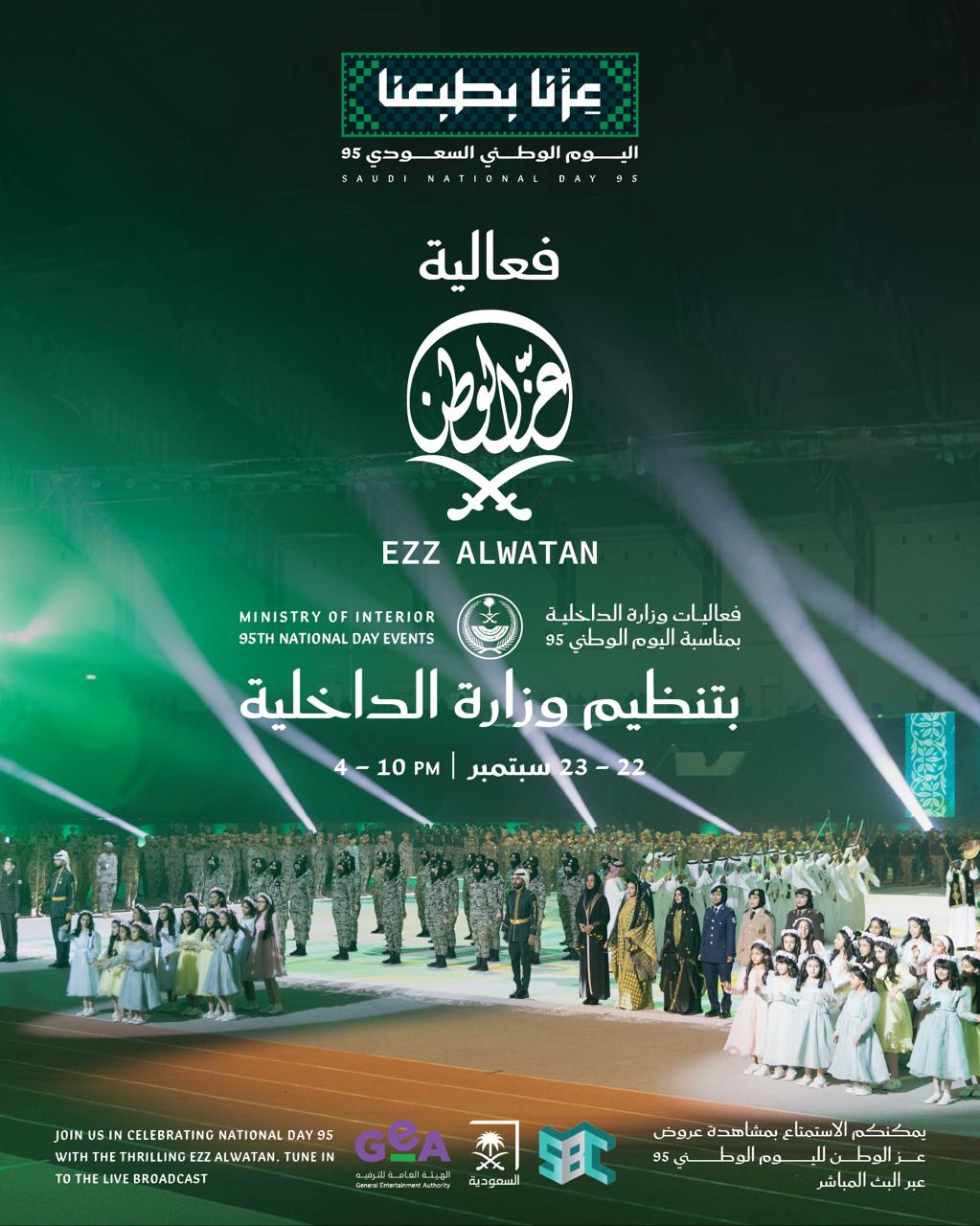 تقيم وزارة الداخلية، بالشراكة مع الهيئة العامة للترفيه (GEA)، فعالية “عز الوطن” احتفاءً باليوم الوطني الخامس والتسعين للمملكة، وذلك يومي 22 و 23 سبتمبر الجاري، في منطقة بنبان بمدينة الرياض، من الساعة الرابعة حتى العاشرة مساءً.