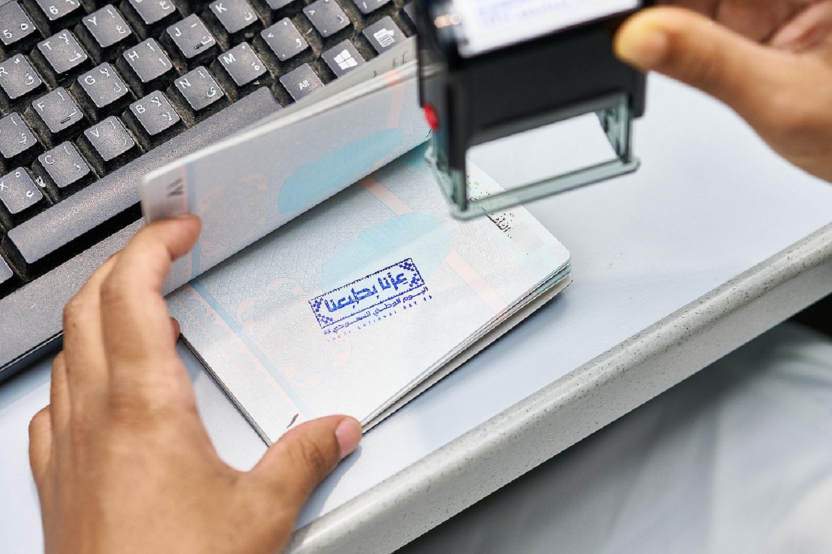 ويأتي ذلك ضمن فعاليات الاحتفال مع المسافرين المغادرين والقادمين عبر المنافذ الدولية للمملكة، تختم به جوازاتهم توثيقًا ورمزًا لهذه المناسبة المجيدة.