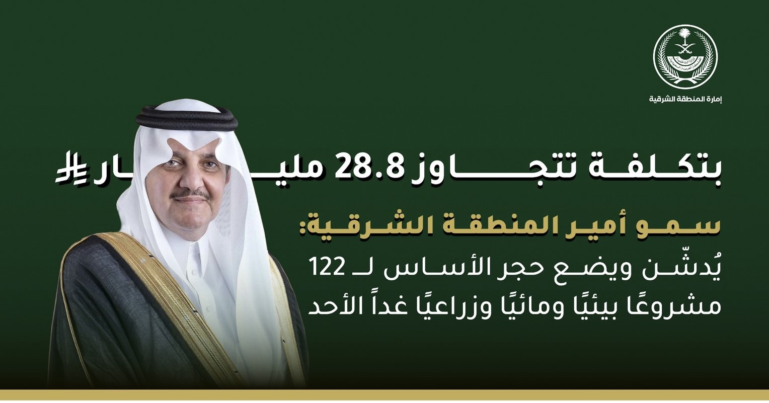 يشهد أهالي المنطقة الشرقية غداً مناسبة تنموية بارزة، مع تدشين صاحب السمو الملكي الأمير سعود بن نايف بن عبدالعزيز أمير المنطقة الشرقية، ووضع حجر الأساس لـ122 مشروعاً بيئياً ومائياً وزراعياً، بتكلفة إجمالية تتجاوز 28.8 مليار ريال، وذلك بحضور معالي وزير البيئة والمياه والزراعة المهندس عبدالرحمن الفضلي.