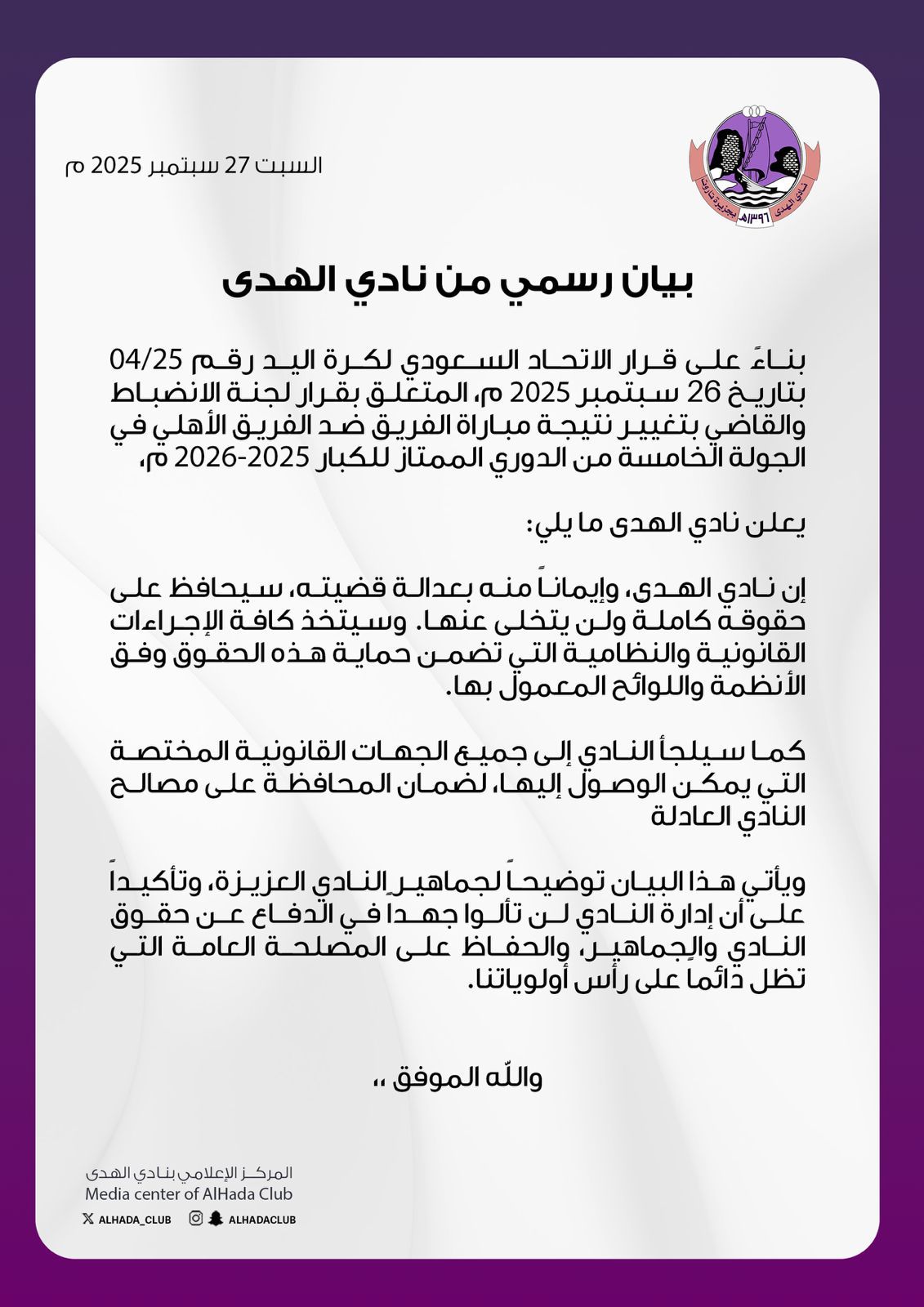 وجاء في البيان أن النادي، بناءً على قرار الاتحاد السعودي لكرة اليد رقم 25/04 بتاريخ 26 سبتمبر 2025م، والمتعلق بقرار لجنة الانضباط والقاضي بتغيير نتيجة مباراة الفريق ضد الفريق الأهلي في الجولة الخامسة من الدوري الممتاز للكبار 2025-2026م، يؤكد أنه سيتخذ كافة الإجراءات القانونية والنظامية لضمان الحفاظ على حقوق النادي.