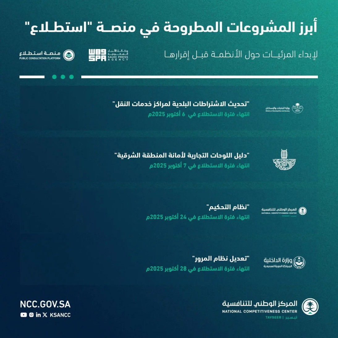 وطرح المركز الوطني للتنافسية عبر المنصة مشروع (نظام التحكيم)؛ بهدف تطوير الإطار النظامي للتحكيم وتحديثه، ومواكبة أحدث التوجهات العالمية، وتعزيز البنية الأساسية لتسوية المنازعات في المملكة، وينتهي الاستطلاع على المشروع بتاريخ 24 أكتوبر 2025م.