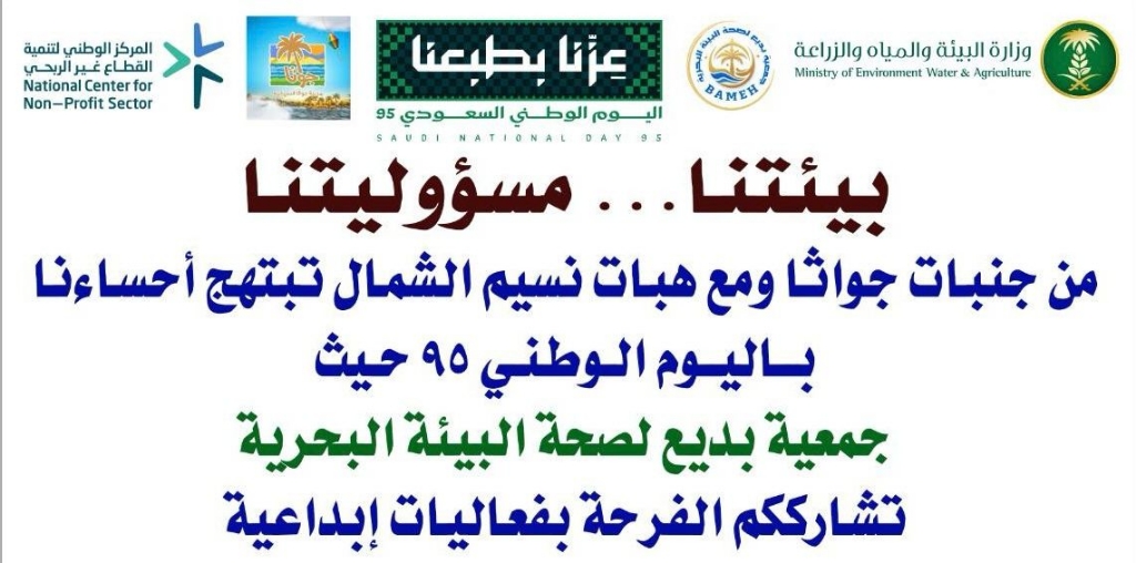 انطلاقا ً من رسالتها بتقديم خدمات إنسانية واجتماعية، جسّدت جمعية بديع لصحة البيئة البحرية مؤخراً مناسبة اليوم الوطني تجسيدا ً معنوياً ، وذلك بغرس وتوزيع ما يقارب 300 شتلة زراعية بمراسيم الحفل بمدينة جواثا السياحية بالأحساء .