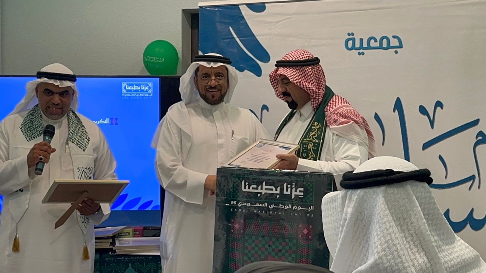 كما قدم الرئيس التنفيذي لجمعيه مساندون الاستاذ سلمان الراشد كلمه ترحيبيه استعرض فيها من خلال عرس مرئي ابرز انجازات جمعيه مساندون خلال العام ٢٠٢٥ وما قدمته من برامج وفعاليات وانشطه توعويه وتثقيفيه واستشارات وثم تم القاء قصيده في حب الوطن قدمها الشاعر المبدع عبدالكريم الحجاب نالت استحسان الجميع واعجاب الحضور وثم القى الاستاذ حسين الحاجي كلمه تعريفيه عن جمعيه انتماء وطني وتلى ذلك القيام بتوقيع الشراكات المجتمعيه من قبل رئيس مجلس اداره جمعيه مساندون مع كلا من الرئيس التنفيذي لجمعيه السكر والغدد الصماء الاستاذه خديجه الحنوه ومع الرئيس التنفيذي لمجموعه مراكز مملكه الاطباء للتدريب الصحي استشاري جراحه الوجه والفكين الدكتور طلال بوخمسين ومع رئيس مجلس اداره جمعيه عطاء الاستاذ علي الحسن ومع نادي صناعه النجوميه الذي شارك جمعيه مساندون في دعم بعض انشطتها خلال الفترات الماضيه وثم توجه الدكتور علي بوخمسين بالشكر لكافه منسوبي القطاع الغير ربحي ممن سخروا انفسهم لخدمه المجتمع والوطن وخص بالشكر رجال الاعمال من القطاع الخاص ممن يدعمون الجمعيات الخيريه وكل من يتبرع من افراد هذا المجتمع الكريم بقصد دعم القطاع الغير ربحي وقدم شكره لسعاده الرئيس التنفيذي لمجموعه المعلم القابضه الاستاذ حسين عبدالوهاب المعلم و لكافه الجهات الداعمه لجمعيه مساندون للدعم النفسي والاجتماعي وثم تم تقديم الدروع التكريميه للعديد من الجهات الحاضره ولبعض منسوبي جمعيه مساندون لخدماتهم المقدمه للجمعيه وكذلك لبعض الجهات الراعيه لنشاط الجمعيه وثم تم اختتام الحفل بقيام الحضور بتسجيل كلمات تعبر عن مشاعرهم تجاه الوطن في اليوم الوطني على جداريه خاصه صممت لهذا الغرض كلوحه جماليه تعبر عن الانتماء للوطن المفدى .